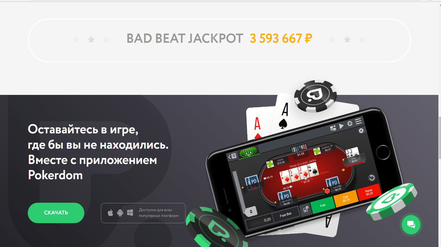 В PokerDom присутствует бэд-бит джекпот – особый вид бонуса, который дается, как это ни странно, за проигрыши в раздаче.