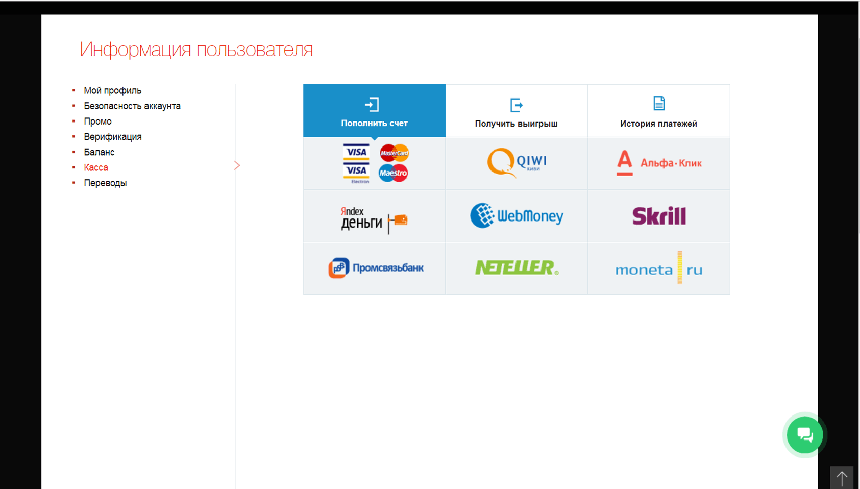 Дальше необходимо перейти в раздел «Касса» и выбрать пункт «Пополнить счет». Откроется страница с доступными платежными площадками, игроку нужно выбрать наиболее подходящую ему систему. Автоматически сформируется квитанция на оплату услуг, здесь требуется внимательно заполнить реквизиты и нажать на кнопку «Оплатить». На баланс поступит указанная в заявке сумма денег.