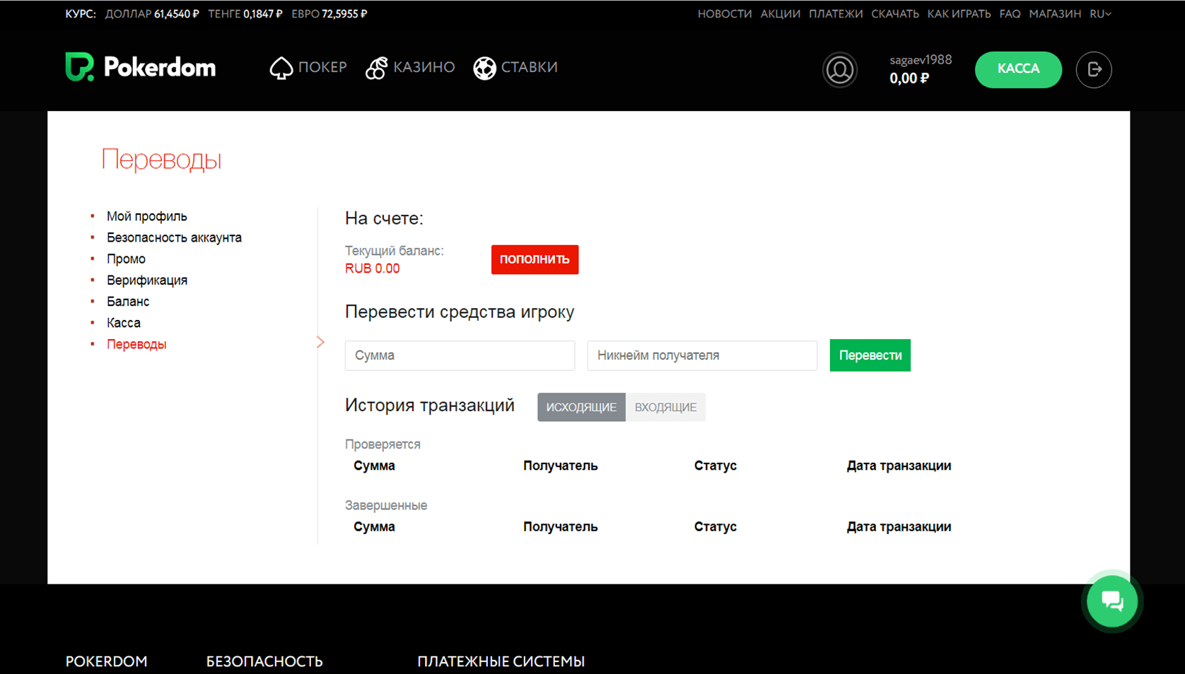Это все разделы личного кабинета ПокерДом. В правом верхнем углу главной страницы ресурса есть вкладки «Касса», ник игрока и форма для выхода из учетной записи.