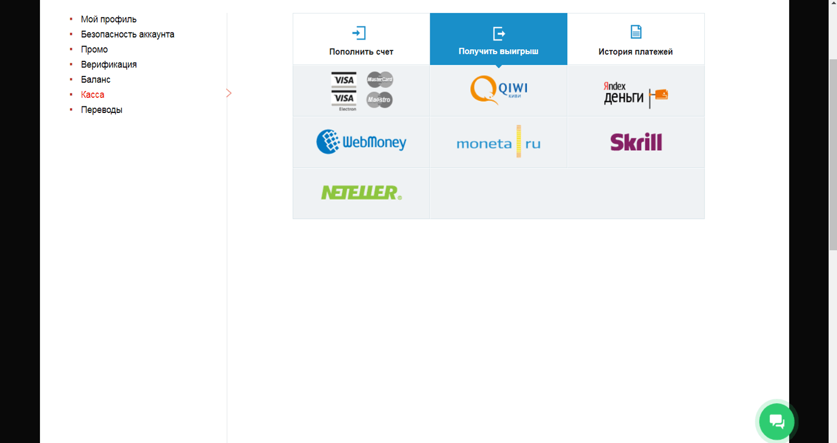 Здесь пользователь может отправить заявку на получение выплаты. Для вывода доступны электронные кошельки Вебмани, Киви, ЯД, Нетеллер, Скрилл, Монета, а также банковские карты Виза, Мастеркард и Маэстро.