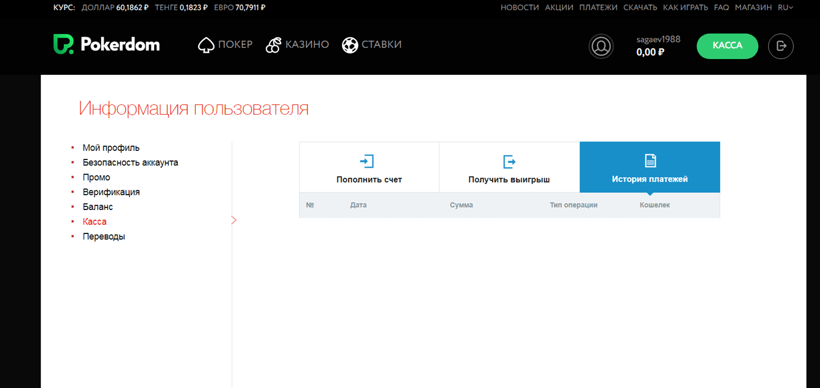 В этом разделе отображается информация о проведенных пользователем финансовых транзакциях. Слева находится номер операции, затем дата, сумма, тип платежа, номер кошелька. Отсюда удобно следить за движением денег на балансе и вести статистику проигрышей и успеха.