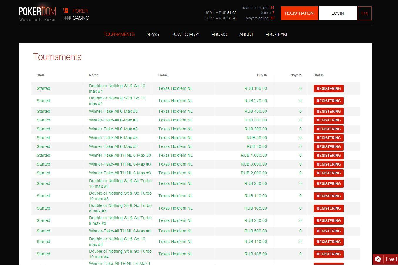 Особенно радует тот факт, в PokerDom в бесплатных турнирах обычно участвует 100-200 человек, что дает неплохие шансы на победу. В зарубежных комнатах в таких же состязаниях набирается по 10 000 пользователей.