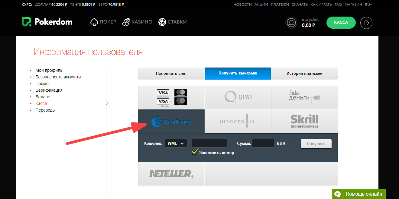 Для начала расскажем, как вывести деньги с ПокерДом, процедура довольно простая и не должна вызвать особых затруднений у пользователя.